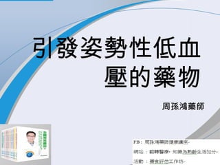 本文档列出了多种药物及其成分和用途,包括用于姿势性低血压、抗抑郁症、巴金森氏症、精神分裂症、利尿剂、肌肉松弛剂、止痛药、勃起障碍、镇静安眠药及血管舒张剂。这些药物涉及多种治疗领域,提供了具体的成分和预期的医疗效果。文档是药物分类的详细列表,对药师和医疗人员提供了参考。