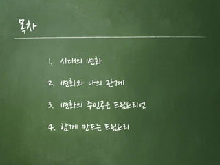 #3 네,오늘 제가 여러분에게 전해드릴 내용은 우선 요즘의 변화들,그게 어떻게 청소년들과 관계가 있는지,그 변화들과 드림트리의 관계,마지막으로 드림트리에 함께 참여하는 방법..이런 순서로 설명드리려고 해요.그리고 시간이 되면,여기에서 시연과,가입,그리고 여러분의 즉석 질문받는 시간 갖도록 하겠습니다.