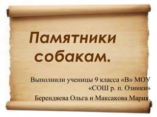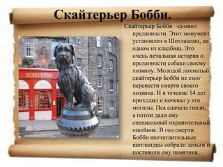 Документ описывает ряд памятников, посвященных выдающимся собакам за их преданность и заслуги. Рассматриваются истории таких собак, как Бобби, Донна, Шеп, Хатико и Балто, каждая из которых символизирует верность и самоотверженность. Эти памятники расположены в различных странах и подчеркивают важность защиты и заботы о животных.