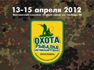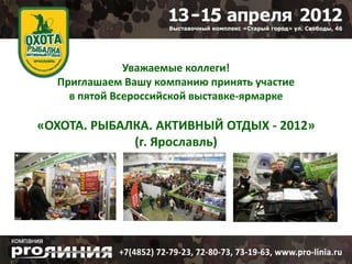 Документ представляет приглашение к участию в пятой всероссийской выставке-ярмарке «Охота. Рыбалка. Активный отдых - 2012» в Ярославле, где участники смогут найти оптовых покупателей, продавать продукцию и укреплять имидж компании. Выставка проходит с 13 по 15 апреля 2012 года, предлагает различные условия участия, включая стоимость выставочных мест и дополнительные сборы. Также приведены итоги предыдущей выставки и информация о рекламной кампании и деловых мероприятиях.