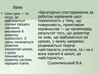 Урок Саме урок— те місце, де відбуваються основні процеси навчання, виховання й розвитку особистості. З уроку починається розвиток конкретної школи, з уроку починається розвиток системи народної освіти. «Багаторічні спостереження за роботою керівників шкіл переконують у тому, що поверховість, примітивізм керівництва — це насамперед результат того, що директор не знає, що відбувається на уроках, у якому напрямку розвивається творча майстерність учителя, та і чи є вона взагалі в школі, ця майстерність». Сухомлинський В.А.