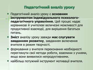 Педагогічний аналіз урокуПедагогічний аналіз уроку є основним інструментом індивідуального психолого-педагогічного управління. Цей процес надає керівникові й учителеві величезні можливості для продуктивної взаємодії, для вирішення багатьох питань. Зміст аналізу уроку завжди має слугувати завданням розвитку , завданням включення вчителя в режим творчості. формування у вчителя переконання необхідності переглянути свої методи роботи, взаємини з учнями, якщо вони виявилися непродуктивними. найбільш потужний інструмент мотивації вчителя.