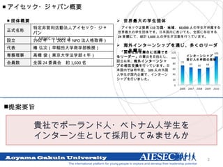 ポーランド人学生・ベトナム人学生 インターン採用企画のご提案 団体概要提案の要旨 提案の詳細 実例 具体的な流れ 費用に関して アンケート項目 ■ ご提案 ■ 提出者 特定非営利活動法人アイセック・ジャパン 会員団体青山学院大学委員会 本企画責任者:豊川陽 青山学院大学 国際政治経済部 3 年 E-mail: atoyokawa.aiesec@gmail.com - 2.