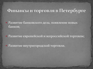 Документ описывает экономическое развитие Санкт-Петербурга, включая рост банковского дела, торговли и промышленности в XIX и начале XX века. Основное внимание уделяется крупнейшим банкам и производственным предприятиям, их архитектурным особенностям и значению для экономики города. Показаны основные направления финансирования и характерная продукция промышленных заводов, включая военную технику и товары повседневного спроса.