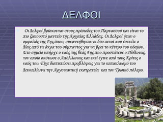 ΔΕΛΦΟΙ Οι Δελφοίβρίσκονται στους πρόποδες του Παρνασσού και είναι το πιο ξακουστό μαντείο της Αρχαίας Ελλάδας. Οι Δελφοί ήταν ο ομφαλός της Γης,όπου, συναντήθηκαν οι δύο αετοί που έστειλε ο Δίας από τα άκρα του σύμπαντος για να βρει το κέντρο του κόσμου. Στο σημείο υπήρχε ο ναός της θεάς Γης που προστάτευε ο Πύθωνας, τον οποίο σκότωσε ο Απόλλωνας και εκεί έγινε από τους Κρίτες ο ναός του. Είχε διατυπώσει προβλέψεις για το κατακλυσμό του Δευκαλίωνα την Αργοναυτική εκστρατεία και τον Τρωικό πόλεμο.