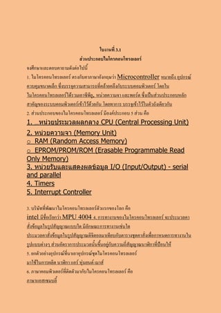 ส่วนประกอบไมโครคอนโทรลเลอร์ จงศึกษาและตอบคาถามดังต่อไปนี้ 1. ไมโครคอนโทรลเลอร์ ตรงกับคาภาษาอังกฤษว่า Microcontroller หมายถึง อุปกรณ์ ควบคุมขนาดเล็ก ซึ่งบรรจุความสามารถที่คล้ายคลึงกับระบบคอมพิวเตอร์ โดยใน ไมโครคอนโทรลเลอร์ได้รวมเอาซีพียู, หน่วยความจา และพอร์ต ซึ่งเป็นส่วนประกอบหลัก สาคัญของระบบคอมพิวเตอร์เข้าไว้ด้วยกัน โดยทาการ บรรจุเข้าไว้ในตัวถังเดียวกัน 2. ส่วนประกอบของไมโครคอนโทรลเลอร์ มีองค์ประกอบ 5 ส่วน คือ 1. ....หน่วยประมวลผลกลาง CPU (Central Processing Unit) 2. หน่วยความจา (Memory Unit) o RAM (Random Access Memory) o EPROM/PROM/ROM (Erasable Programmable Read Only Memory) 3. หน่วยรับและแสดงผลข้อมูล I/O (Input/Output) - serial and parallel 4. Timers 5. Interrupt Controller 3. บริษัทที่พัฒนาไมโครคอนโทรลเลอร์ตัวแรกของโลก คือ intel มีชื่อเรียกว่า MPU 4004 4. การทางานของไมโครคอนโทรลเลอร์ จะประมวลคา สั่งข้อมูลในรูปสัญญาณแบบใด มีลักษณะการทางานเช่นใด ประมวลคาสั่งข้อมูลในรูปสัญญาณดิจิตอลมาเทียบกับตารางชุดคาสั่งเพื่อกาหนดการทางานใน รูปแบบต่างๆ ส่วนอัตราการประมวลนั้นขึ้นอยู่กับความถี่สัญญาณนาฬิกาที่ป้อนให้ 5. ยกตัวอย่างอุปกรณ์ที่นาเอาอุปกรณ์ชุดไมโครคอนโทรลเลอร์ มาใช้ในการผลิต นาฬิกา แอร์ หุ่นยนต์ เมาส์ 6. ภาษาคอมพิวเตอร์ที่ติดตัวมากับไมโครคอนโทรลเลอร์ คือ ภาษาแอสเซมบลี้