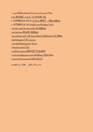 BAISC ภาษา C หรือ PASCAL 8. ATMEGA-16 คือ หัวใจของ IPST – MicroBox 9. ATMEGA-16 มีองค์ประกอบที่สาคัญอะไรบ้าง -หน่วยความจาโปรแกรมภายใน 16 kByte -หน่วยความจา RAM 1kByte -ทางานด้วยความเร็ว 16 ล้านคาสั่งต่อวินาทีที่คริสตอล 16 MHz -พอร์ตอินพุตเอาร์ 32 ตาแหน่ง -วงจรพัลล์วิดธ์มอดูเลเตอร์ 4 ช่อง -ไทเมอร์เคาน์เตอร์ 3ตัว -การสื่อสารอนุกรม SPI/I2C/USART -วงจรแปลงสัญญาณอะนาลอกเป็นดิจิตอล 10บิต 8ช่อง -สามารถโปรแกรมและลบได้นับหมื่นครั้ง นายสุริยาวุธ ตรีชัย เลขที่ 5 ชั้น ม.4/5