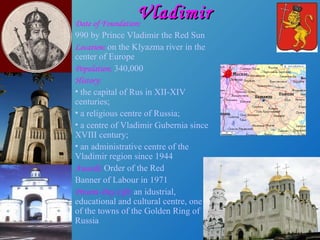 Vladimir is a historic city in western Russia founded in 990 AD. It has a population of 340,000 and was formerly the capital of Rus in the 12th-14th centuries. Some of its most notable landmarks include the Golden Gate built in 1158-1164 as the main entrance to the city, and the Cathedral of the Assumption, a five-domed Orthodox church constructed in 1158-1160 that served as the main church of the region. Both landmarks are now part of the Vladimir and Suzdal museum and are UNESCO World Heritage sites.