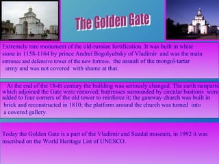 The document summarizes the history and significance of three landmarks in Vladimir, Russia: