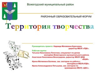 Вожегодский муниципальный район организует образовательный форум 'Территория творчества', целью которого является развитие творческих способностей молодежи через палаточный лагерь на реке Кубена. Проект включает в себя обучение, командные активности и выявление талантов, с акцентом на волонтерское движение и создание молодежного медиа. Форум получил поддержку и участие молодых людей, укрепляя их патриотизм и сознательность, и будет продолжен в будущем, учитывая положительные отзывы участников.