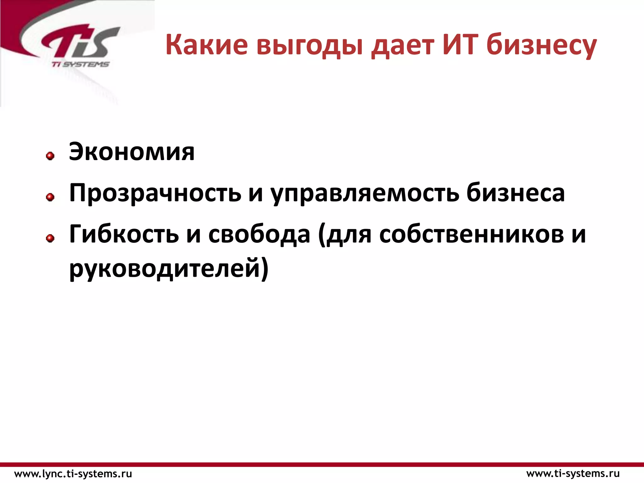 Документ описывает преимущества внедрения информационных технологий в бизнесе, такие как экономия времени и средств, прозрачность и управляемость. Приводятся конкретные цифры экономических выгод, включая экономию на командировках и оптимизацию рабочего времени. Также рассматриваются аспекты гибкости, мобильности и индивидуального подхода к решениям для компаний.