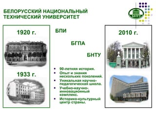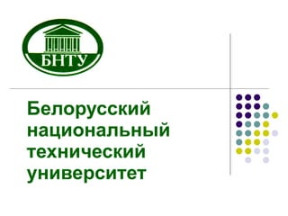 Белорусский национальный технический университет (БНТУ) является ведущим высшим инженерно-техническим учебным заведением в Беларуси с 90-летней историей, комплектующим свыше 30 тысяч студентов по более чем 120 специальностям. Университет имеет 17 факультетов, 7 институтов и активно участвует в международных научных проектах, обучая также иностранных граждан. Научная и инновационная деятельность БНТУ включает исследования в различных областях и создание высокотехнологичных предприятий.