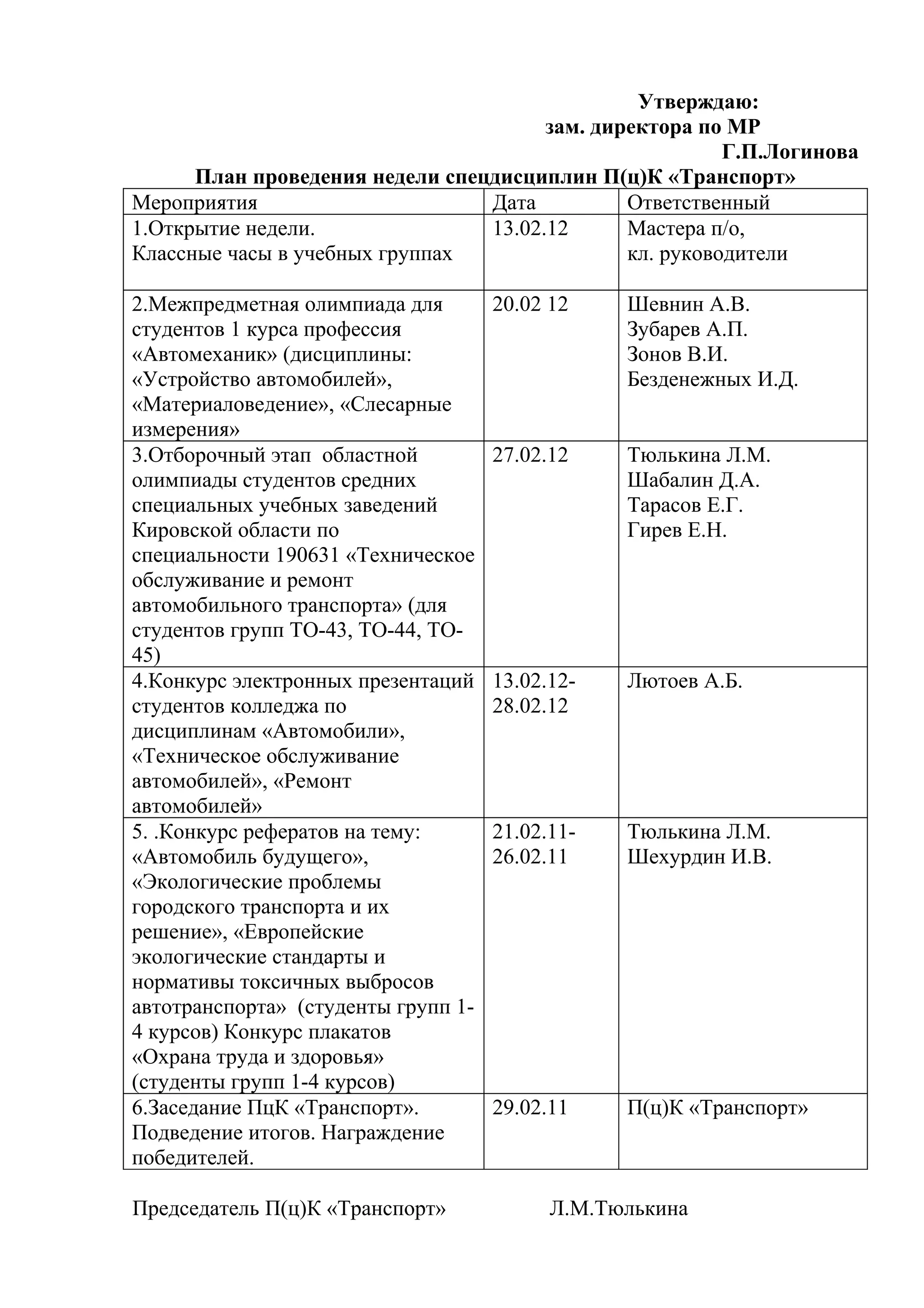 Документ содержит план проведения недели специальных дисциплин по профессии «автомеханик», включая различные мероприятия, такие как открытие недели, межпредметные олимпиады, конкурсы рефератов и электронных презентаций. Учащиеся будут участвовать в разных конкурсах и олимпиадах, которые требуют выполнения теоретических и практических заданий по дисциплинам. Все работы и презентации должны быть сданы до 26 февраля 2012 года.