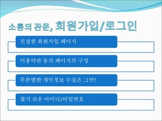 회원가입 페이지의 중요성사용자와 서비스 제공업체의 밀접한 관계를 맺는 첫 단계 대부분의 온라인 서비스가 이를 이용하기 위해서는 회원가입이 필수요소 회원가입 페이지의 구성에 따라 회원가입 성공률이 결정 회원가입 시 사용자를 불편하게 하는 요소 필수입력 항목과 선택입력 항목의 불분명한 구분 아이디 / 비밀번호 / 닉네임 등에 대한 제한사항 미표시 입력정보에 대한 자동저장 미지원