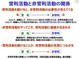 新しい公共(共助)の時代 新しい公共:自助・共助・公助の中の「共助」 ・自助を支える共助 ・ 「小さな官」のもとでの「豊かな公」を提供する「民」の力 ・草の根の力、民間資金の活用 ・官民協働:その基本は民主導。まずは民が動くこと。 ・後ろから官(資金や制度)がついてくるもの(支援する立場)。 ・「公」は、昔からそれぞれの立場で、主体性をもってやるべきこと。 公 公 ボランティア