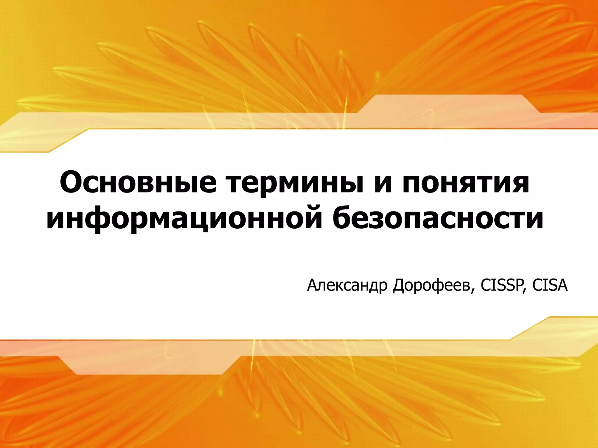 Документ содержит основные термины и понятия в области информационной безопасности, включая определения информации, угроз, рисков, уязвимостей, контрмер, политики, процедур, стандартов и аудита. Он акцентирует внимание на важности минимизации рисков и соблюдения установленных практик, таких как аудит соответствия стандартам. Автором документа является Александр Дорофеев, эксперт в данной области.