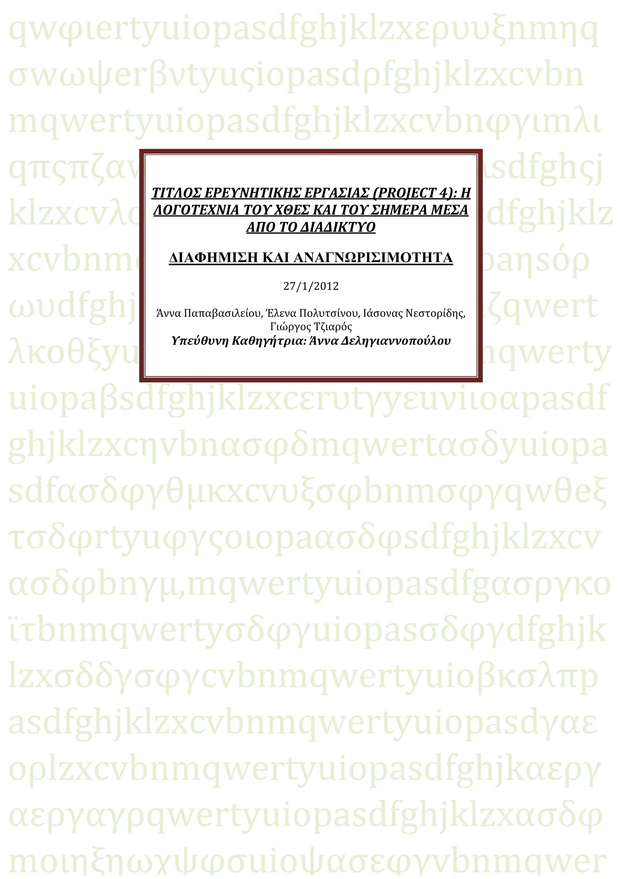 ΣΙΣΛΟ ΕΡΕΤΝΗΣΙΚΗ ΕΡΓΑΙΑ (PROJECT 4): Η klzxcvλοπbnαmqwertyuiopasdfghjklz ΛΟΓΟΣΕΧΝΙΑ ΣΟΤ ΧΘΕ ΚΑΙ ΣΟΤ ΗΜΕΡΑ ΜΕΑ ΑΠΟ ΣΟ ΔΙΑΔΙΚΣΤΟ xcvbnmςγqwφertyuioςδφpγρaηsόρ ΓΙΑΦΗΜΙΗ ΚΑΙ ΑΝΑΓΝΩΡΙΙΜΟΣΗΣΑ 27/1/2012 ωυdfghjργklαzxcvbnβφδγωmζqwert Άννα Παπαβαςιλείου, Έλενα Πολυτςίνου, Ιϊςονασ Νεςτορίδησ, Γιώργοσ Τζιαρόσ λκοθξyuiύαςφdfghjklzxcvbnmqwerty Τπεύθυνη Καθηγήτρια: Άννα Δεληγιαννοπούλου uiopaβsdfghjklzxcεrυtγyεuνiιoαpasdf ghjklzxcηvbnαςφδmqwertαςδyuiopa sdfαςδφγθμκxcvυξςφbnmςφγqwθeξ τςδφrtyuφγσοιopaαςδφsdfghjklzxcv αςδφbnγμ,mqwertyuiopasdfgαςργκο ΰτbnmqwertyςδφγuiopasςδφγdfghjk lzxςδδγςφγcvbnmqwertyuioβκςλπp asdfghjklzxcvbnmqwertyuiopasdγαε ορlzxcvbnmqwertyuiopasdfghjkαεργ αεργαγρqwertyuiopasdfghjklzxαςδφ mοιηξηωχψφςuioψαςεφγvbnmqwer