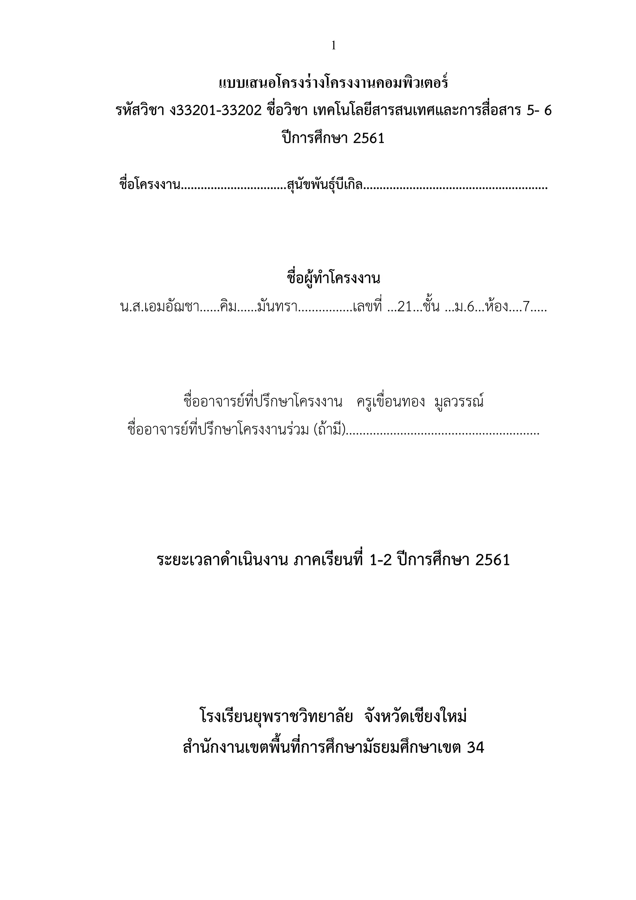 1 แบบเสนอโครงร่างโครงงานคอมพิวเตอร์ รหัสวิชา ง33201-33202 ชื่อวิชา