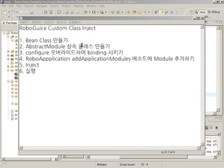 • RoboApplication 에서 모듈추가를 하지 않고, res/values/roboguice.xml 외부파일로 모듈을