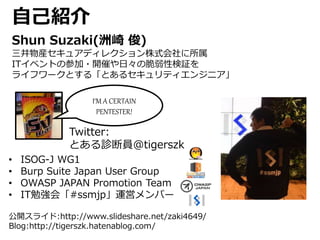 ISOG-J WG1 • Burp Suite Japan User Group • OWASP JAPAN Promotion Team • IT勉強会「#ssmjp」運営メンバー I‘M A CERTAIN PENTESTER! 公開スライド:http://www.slideshare.net/zaki4649/ Blog:http://tigerszk.hatenablog.com/
