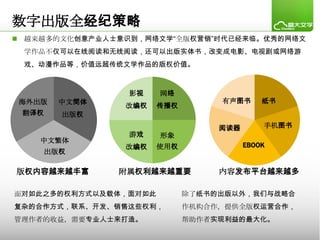文档讨论了数字出版的全经纪策略及其在文化创意产业中的重要性,强调了网络文学作品的多样价值及版权的多种形式和渠道。盛大文学在中国市场中处于领先地位,通过市场研究、专业包装和版权整合营销来优化作品收益,同时成功进行了多项影视和游戏改编。文中提到的成功案例展示了数字出版的潜力,以及如何通过各种合作方式实现作者利益最大化。