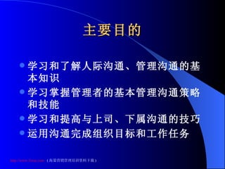 本文件探讨了组织管理沟通的基本概念,包括人际沟通的特点、管理沟通策略和技能。重点在于提高与上司和下属的沟通效率,以实现组织目标。管理者的沟通环境、策略、技能以及与员工的沟通技巧是实现有效管理沟通的关键。
