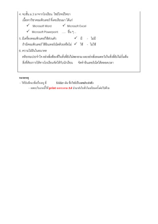 มาจากโรงเรียน ไชย์โรจน์วิทยา เนื้อหา/วิชาคอมพิวเตอร์ ที่เคยเรียนมา ได้แก่ Microsoft Word Microsoft Excel Microsoft Powerpoint …. อื่น ๆ .. 5. มีเครื่องคอมพิวเตอร์ใช้ส่วนตัว มี - ไม่มี ถ้ามีคอมพิวเตอร์ ใช้อินเทอร์เน็ตด้วยหรือไม่ ใช้ - ไม่ใช้ 6. ความใฝ่ฝันในอนาคต คติธรรมประจาใจ อย่าเพิ่งท้อแท้ในสิ่งที่ยังไม่พยายาม และอย่าเพิ่งหมดหวังในสิ่งที่ยังไม่เริ่มต้น สิ่งที่ต้องการให้ทางโรงเรียนจัดให้กับนักเรียน จัดทาอินเตอร์เน็ตได้ตลอดเวลา หมายเหตุ - ให้บันทึกมาที่เครื่องครู ที่ folder เดิม ชื่อไฟล์เป็นเลขประจาตัว - เฉพาะใบงานนี้ให้ print ลงกระดาษ A4 นามาส่งในชั่วโมงเรียนครั้งต่อไปด้วย