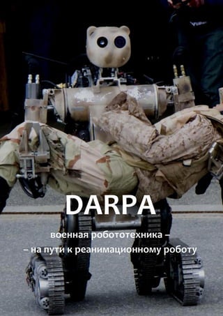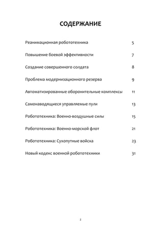 Документ обсуждает развитие реанимационной робототехники в военных условиях, подчеркивая необходимость создания роботизированных систем для оказания медицинской помощи на поле боя. Также рассматриваются проекты, направленные на создание идеального солдата, способного функционировать без сна и еды в течение длительного времени. В документе поднимается вопрос о внедрении современных робототехнических технологий в армии и проблемах, связанных с модернизацией военной техники.