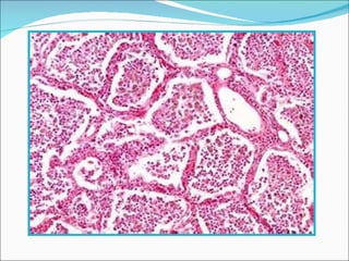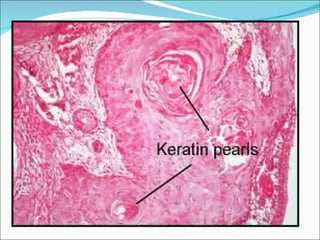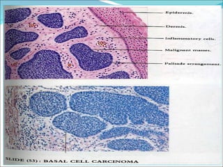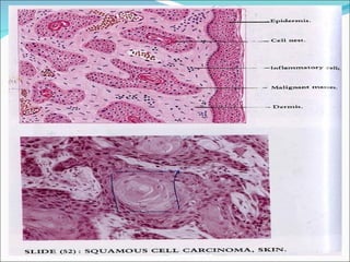 3) The document provides detailed summaries of the histological features seen in slides of various common benign and malignant epithelial and mesen