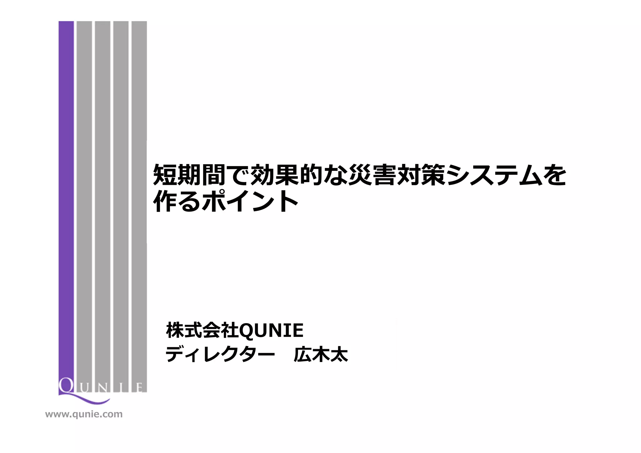 ITシステムは、集中と分散を繰り返しながら、その適用範囲を 拡大しています。 今まで以上に、未知・想定外 の問題を対応するため、災害対策シ ステムの早期実現は必須となっています。 近年、様々の災害対策のソリューションが発表されており、低コス ト・短期間で災害対策システムを構築することも、ポイントを誤ら なければ可能となっています。 災害対策システムの構築は作って終わりではありません。システム 変化にあわせて、随時改善を行なっていく必要があります。また、 改善を実施が可能なソリューションの選択、システムの構築が重要 となります。 © 2012 QUNIE CORPORATION. All rights reserved.