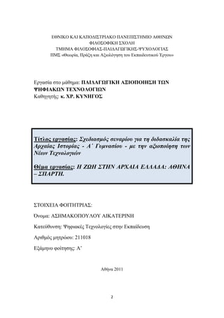 ΠΑΝΔΠΗΣΖΜΗΟ ΑΘΖΝΧΝ ΦΗΛΟΟΦΗΚΖ ΥΟΛΖ ΣΜΖΜΑ ΦΗΛΟΟΦΗΑ-ΠΑΗΓΑΓΧΓΗΚΖ-ΦΤΥΟΛΟΓΗΑ ΠΜ «Θεσξία, Πξάμε θαη Αμηνιόγεζε ηνπ Δθπαηδεπηηθνύ Έξγνπ» Δξγαζία ζην κάζεκα: ΠΑΙΓΑΓΧΓΙΚΗ ΑΞΙΟΠΟΙΗΗ ΣΧΝ ΦΗΦΙΑΚΧΝ ΣΔΥΝΟΛΟΓΙΧΝ Καζεγεηήο: θ. ΥΡ. ΚΤΝΗΓΟ Σίηινο εξγαζίαο: ρεδηαζκόο ζελαξίνπ γηα ηε δηδαζθαιία ηεο Αξραίαο Ηζηνξίαο - Α΄ Γπκλαζίνπ - κε ηελ αμηνπνίεζε ησλ Νέσλ Σερλνινγηώλ Θέκα εξγαζίαο: Ζ ΕΩΖ ΣΖΝ ΑΡΧΑΗΑ ΔΛΛΑΓΑ: ΑΘΖΝΑ – ΠΑΡΣΖ. ΣΟΗΥΔΗΑ ΦΟΗΣΖΣΡΗΑ: Όλνκα: AΖΜΑΚΟΠΟΤΛΟΤ ΑΗΚΑΣΔΡΗΝΖ Καηεύζπλζε: Φεθηαθέο Σερλνινγίεο ζηελ Δθπαίδεπζε Αξηζκόο κεηξώνπ: 211018 Δμάκελν θνίηεζεο: Α’ Αζήλα 2011 2