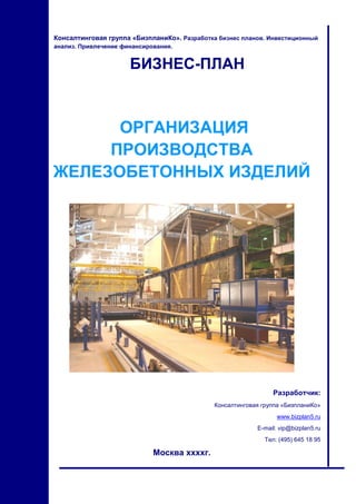 Данный документ представляет собой бизнес-план для организации производства железобетонных изделий в г. Карабулак, Ингушетия, с прогнозируемыми высокими финансовыми показателями и коммерческой привлекательностью. Основные направления включают производство перемычек, блоков, электрических столбов, бордюров и перекрытий, с общей суммой инвестиций, рассчитанной на покрытие подготовительных работ, оборудования и оборотных средств. Проект считается перспективным, учитывая стабильный спрос на железобетонные конструкции в строительной отрасли.