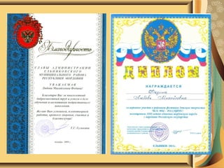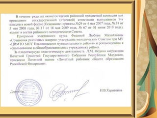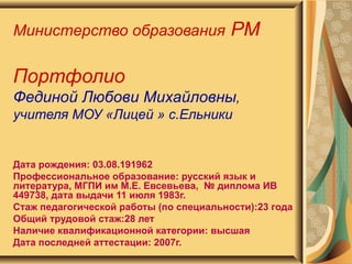 Документ представляет портфолио Фединой Любови Михайловны, учителя русского языка и литературы с опытом работы 23 года. В нем изложены инновационные подходы к обучению с использованием информационных технологий, которые закончили улучшение качества образования и развитие творческих способностей учащихся. Также перечислены достижения и награды, подтверждающие успешность работы автора в образовательной сфере.