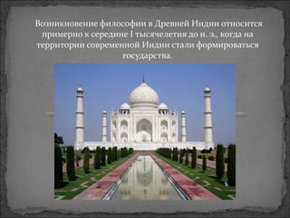 Документ описывает возникновение философии в Древней Индии, выделяя три основных этапа: ведийский, классический и послеклассический. Основное внимание уделяется двум философским направлениям — буддизму и джайнизму, их этическим принципам и взглядам на освобождение от страданий. Также рассматриваются особенности классового общества и философские противоречия между различными школами индийской мысли.