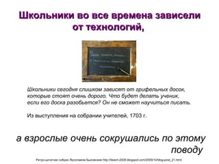Документ анализирует зависимость школьников от технологий на протяжении истории, подчеркивая изменения в используемых инструментах и средствах обучения. Он также обсуждает требования и цели Федеральных государственных образовательных стандартов (ФГОС), акцентируя внимание на необходимости формирования универсальных учебных действий (УУД) у учащихся с использованием информационно-коммуникационных технологий (ИКТ). В заключение рассматриваются методические аспекты и организации обучения, включая использование блогов и интернет-ресурсов для эффективного образовательного процесса.