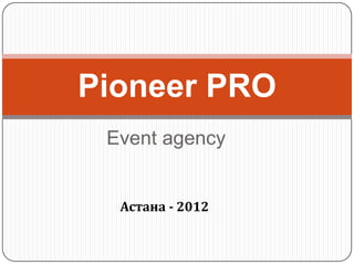 Документ представляет собой ситуационный анализ мероприятия компании Pioneer Pro в Астане, выявляя отсутствие значимых конкурентов на рынке event-услуг. Основные цели включают охват 5% рынка и увеличение продаж на 50% по сравнению с 2011 годом, с акцентом на юридические и государственные заказы. Анализ SWOT подчеркивает как сильные, так и слабые стороны бизнеса, а также потенциал роста и угрозы со стороны новых игроков на рынке.