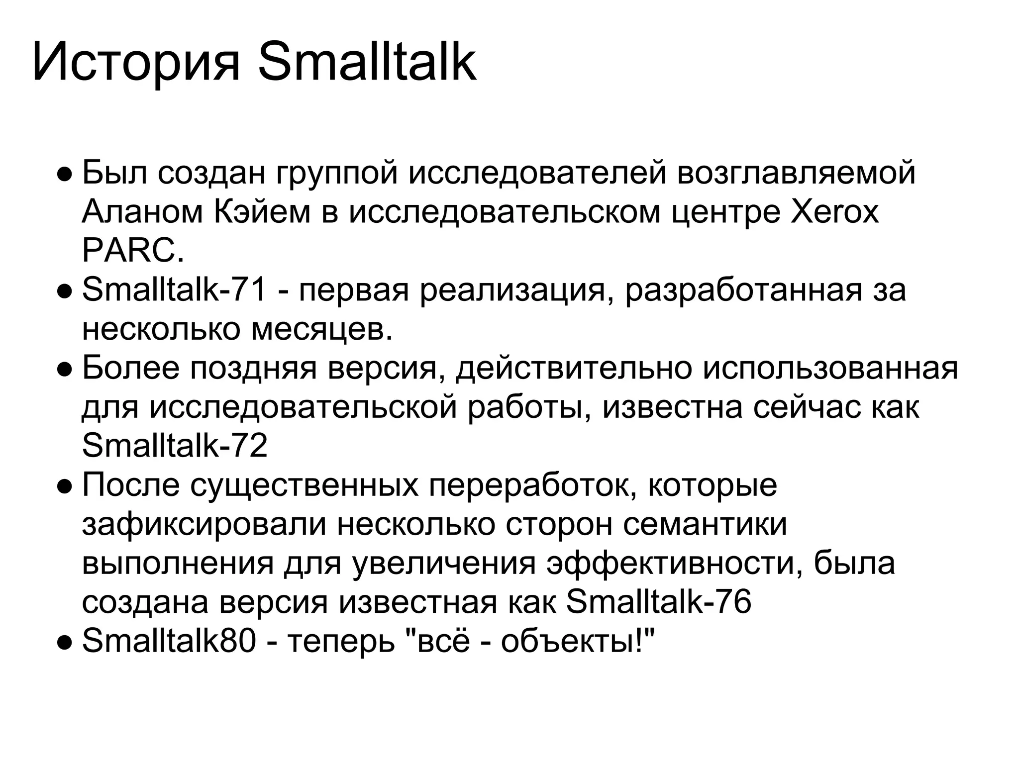 Документ описывает историю и основные концепции языка программирования Smalltalk, который был разработан под руководством Алана Кэя в исследовательском центре Xerox PARC. Он акцентирует внимание на объектно-ориентированном подходе, где объекты являются базовыми единицами, и подчеркивает важность динамической типизации, сборки мусора и простоты синтаксиса. Также рассматриваются лексические особенности и стиль написания программ, что делает Smalltalk уникальным среди других языков программирования.