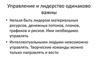 Документ обсуждает управление и лидерство в контексте работы с творческими командами, акцентируя внимание на важности эмоционального интеллекта и способности направлять людей, а не контролировать их. Рассматриваются антипаттерны управления, стратегии лидерства и компетенции эффективного руководителя, а также стадии создания команды, от формирования до продуктивного сотрудничества. Кроме того, подчеркивается необходимость адаптации к индивидуальным особенностям участников и мотивации, чтобы обеспечить высокую эффективность команды.