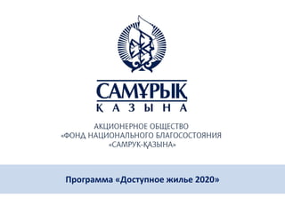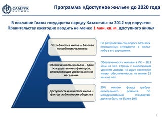 Документ описывает программу «доступное жилье 2020» в Казахстане, нацеленной на создание доступного жилья для населения с целью строительства не менее 1 млн. кв. м в год. Программа включает финансирование через фонд недвижимости «Самрук-Қазына», стимулирование частных инвестиций и внедрение новых технологий в строительстве. Основные параметры включают стоимость строительства, требования к инвесторам и проекты, а также план по обеспечению повышения качества жилья и созданию рабочих мест.