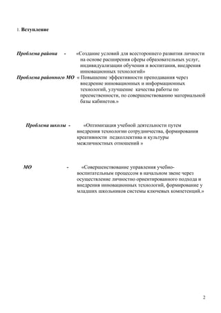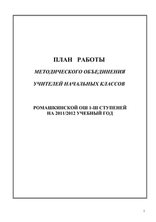 Документ представляет собой план работы методического объединения учителей начальных классов на учебный год 2011/2012, который акцентирует внимание на внедрении инновационных технологий, повышении качества образования и индивидуализации обучения. В нем отмечены достижения за предыдущий год, включая успешное внедрение новых методов и организацию мероприятий для формирования культуры здоровья и общения среди учащихся. Основные задачи на новый учебный год включают изучение нового стандарта образования, повышение уровня естественно-математического образования и создание условий для развития ключевых компетенций учащихся.
