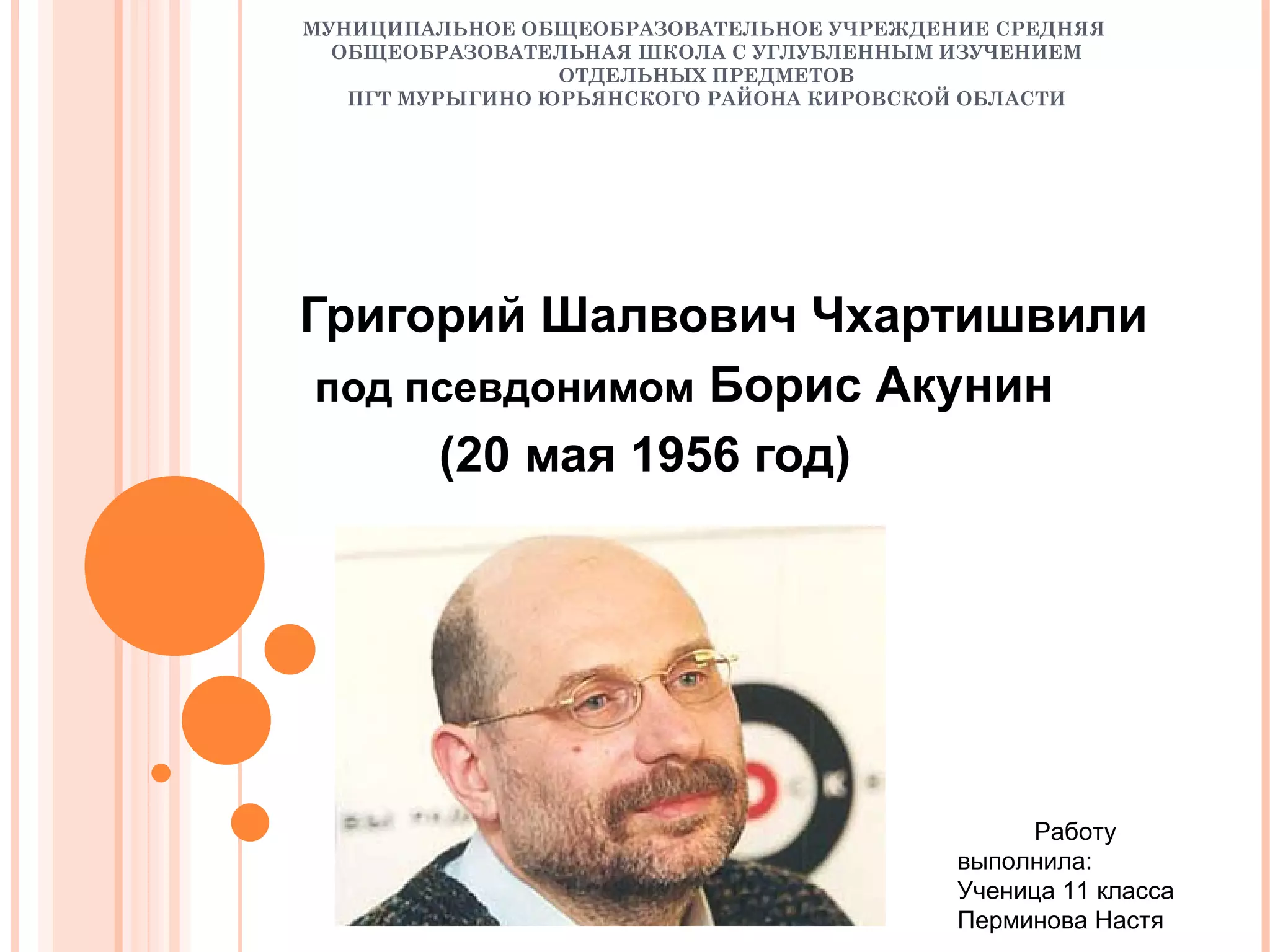Документ представляет биографию Григория Шалвовича Чхартишвили, известного под псевдонимом Борис Акунин, который родился 20 мая 1956 года в Грузии. Он является российским писателем, литературным переводчиком и редактором, наиболее известным благодаря своим детективным романам о Эрасте Фандорине и другим произведениям. Акунин получил ряд наград за вклад в культурные связи между Россией и Японией и продолжает писать художественную прозу.