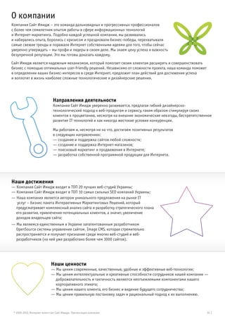 Компания 'Сайт Имидж' представляет собой интернет-агентство с более чем семилетним опытом в сфере информационных технологий и интернет-маркетинга, предлагающее услуги по созданию сайтов, интернет-магазинов и продвижению в поисковых системах. Они входят в топ 20 веб-студий и топ 10 SEO-компаний Украины, предлагая собственную систему управления сайтами и уникальные маркетинговые решения для своих клиентов. Основной целью компании является создание прибыльных веб-продуктов с акцентом на удобство для пользователей и эффективное продвижение.