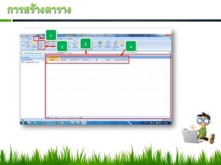 าต่างฐานข้อมูลขึนมา ้ 1. คลิกแท็บสร้าง 2. คลิกเลือกออกแบบตาราง 3. จะได้ตารางในมุมมองออกแบบ 4. กาหนดอย่างน้ อยหนึ่ งเขตข้อมูลโดยใส่ชื่อเขตข้อมูลและเลือกชนิดข้อมูล 5. บันทึกและตังชื่อ ตาราง“ฐานข้อมูลนักเรียน” ้