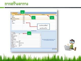 กาหนดฟิลด์และโครงสร้างฐานข้อมูลให้กบตารางซึ่งมีขนตอนดังนี้