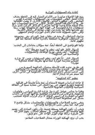 يتناول الوثيقة أهمية إصلاح الإدارة العامة في الخطة الخمسية لدعم البرنامج الاقتصادي للبلاد، مشددًا على الحاجة للإصلاحات الإدارية لتحقيق العدالة والفعالية. يناقش النص مسؤوليات الوزراء وكيفية تنظيم 'آلة الحكومة' لضمان فعالية الحكومات، بما في ذلك توزيع المسؤوليات والمتطلبات لتفادي الازدواجية. كما يقترح إنشاء وزارة خاصة للوظيفة العامة لتحفيز التدريب والتنسيق بين الإدارات.