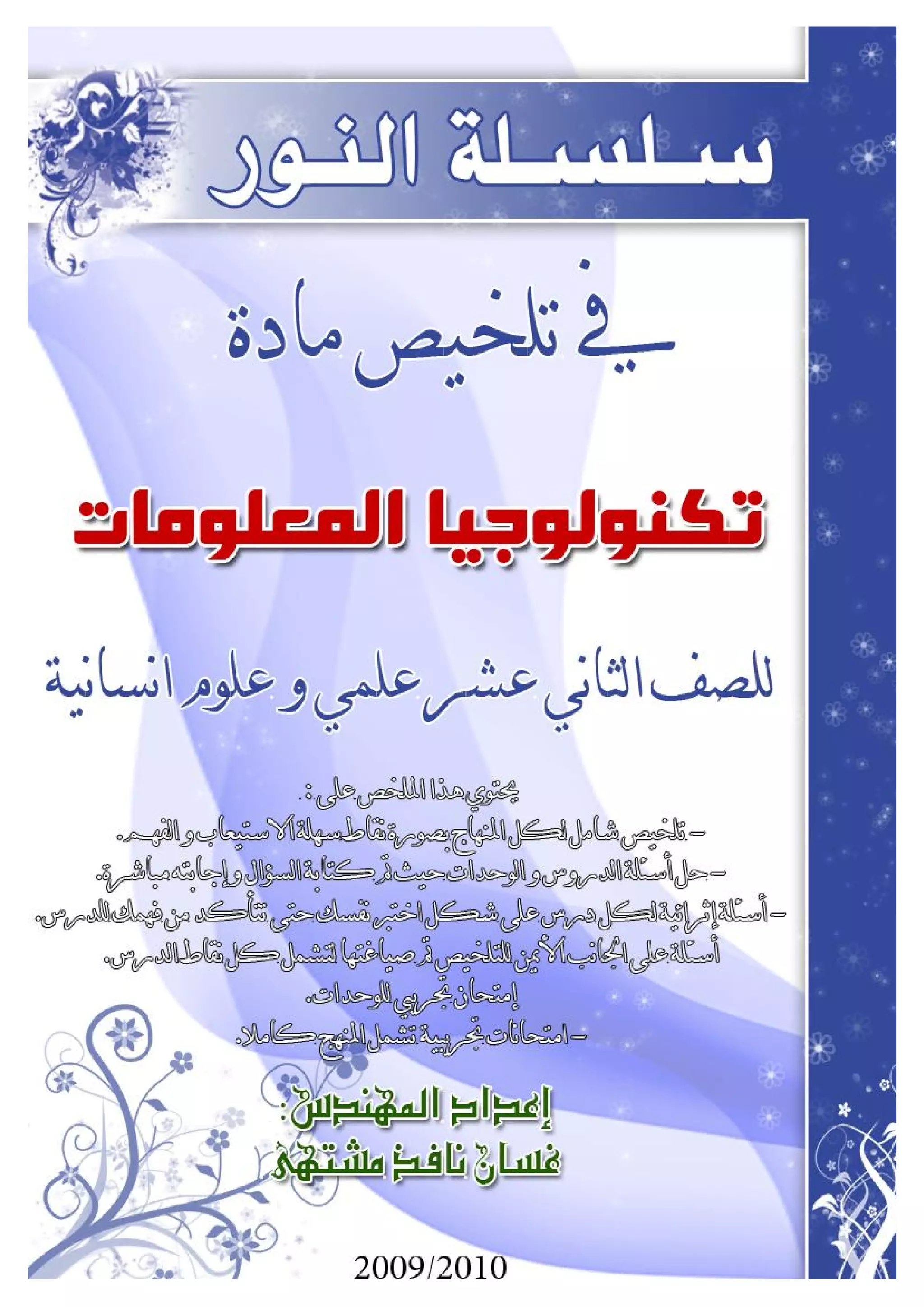 تتناول الوثيقة مفهوم الاتصالات وتعريفها وعناصرها، بالإضافة إلى تقنية التشفير وأنواعها مثل التشفير بالتعويض والتعمية. تتحدث أيضًا عن أنظمة الاتصال وتطورها عبر الزمن، بدءًا من التلغراف وصولًا إلى الأسلاك المجدولة والمحورية والألياف البصرية. كما تتناول الوثيقة دور الدولة في تنظيم الاتصالات وحماية حرية المواطنين.