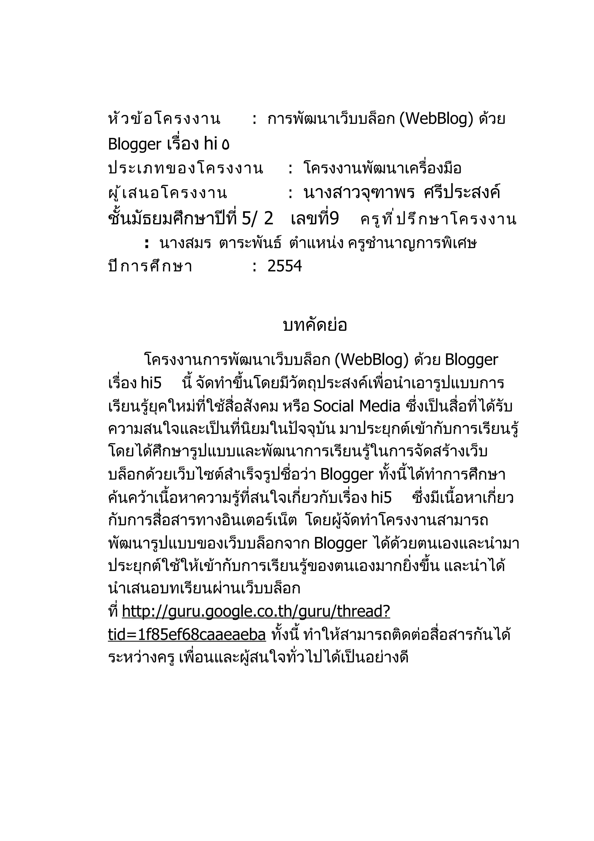 โครงงานการพัฒนาเว็บบล็อก (WebBlog) ด้วย Blogger