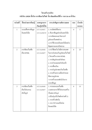 รหัสวิชา ง30201 ชื อวิชา การเขียนเว็บไซต์ ชั* น มัธยมศึกษาปี ที 4 เวลารวม 45 ชั วโมง หน่ วยที ชื อหน่ วยการเรี ยนรู้ มาตรฐานการ สาระสํ าคัญ/ความคิดรวบยอด เวลา นําหนัก * เรียนรู้ /ตัวชี*วด ั คะแนน 1 ระบบสื$ อสารข้อมูล ง 3.1 ม.4-6/1 1. การติดต่อสื$ อสาร 4 5 อินเทอร์ เน็ต ง 3.1 ม.4-6/13 2. ค้นหาข้อมูลผ่านอินเตอร์ เน็ต V.การคัดลอกและวิเคราะห์ รู ปแบบเว็บเพจต่างๆ W.การใช้งานบนอินเตอร์ เน็ตอย่าง มีคุณธรรมและจริ ยธรรม 2 การเขียนเว็บเพ็จ ง 3.1 ม.4-6/6 Z.การใช้เทคโนโลยีสารสนเทศ 8 25 ด้วย HTML ง 3.1 ม.4-6/7 ในการนําเสนอในรู ปของเว็บไซต์ [.โครงสร้าง ภาษา HTML V. การจัดรู ปแบบตัวอักษร W. การกําหนดเลขกํากับหน้า 5. การเชื$อมโยง . การนํารู ปภาพลงในเว็บเพ็จ M. การสร้างตารางเลือกกําหนด ข้อความรู ปภาพ ].การสร้างแบบฟอร์ มในการ กรอกข้อมูล 3 การเขียนเว็บเพ็จ ง 3.1 ม.4-6/6 1. การออกแบบเว็บเพ็จ 8 15 ด้วยโปรแกรม ง 3.1 ม.4-6/7 [.บททวนการใช้โปรแกรมสร้าง สําเร็ จรู ป เว็บเพจ สําเร็ จรู ป V.ปรับปรุ งเว็บไซต์(หน่วยที$ [) W. การสร้างฟอร์ ม . การ FTP บนเครื อข่าย อินเทอร์ เน็ต