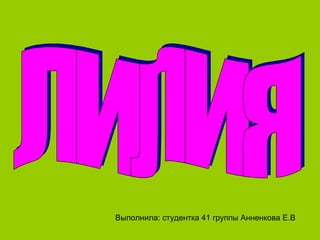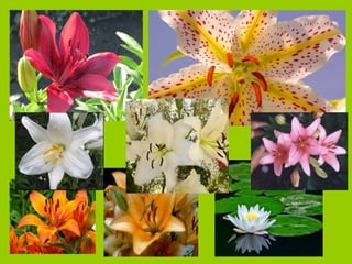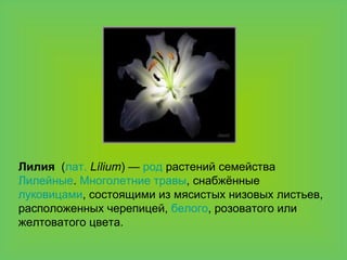 Документ описывает растения рода лилия, их морфологию, размножение и распространение. Лилии являются многолетними травами с луковицами, известными своим красивым цветением и значением в садоводстве. В России присутствует несколько видов лилий, используемых в пищу и для декоративных целей.