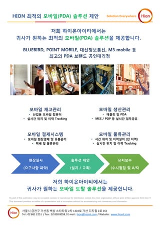 하이온아이티에서는 귀사가 원하는 모바일 토탈 솔루션을 제공합니다. 현장실사 (요구사항 파악) 솔루션 제안 (설치/교육) 유지보수 (수시점검 및 A/S) 모바일 재고관리 산업용 모바일 컴퓨터 실시간 위치 및 이력 Tracking 모바일 생산관리 테블릿 및 PDA MES / POP 등 실시간 업무공유 모바일 결제시스템 모바일 현장결제 및 유통관리 택배 및 물류관리 모바일 물류관리 시간 위치 및 이력설치 (전 지역) 실시간 위치 및 이력 Tracking 서울시 금천구 가산동 백상 스타타워 2차 1304호 가산 디지털 2로 165 Tel : 02 2038 0018 / Fax : 02 2038 0058 / E-mail : hion@hionit.com / Website : www.hionmall.co.kr